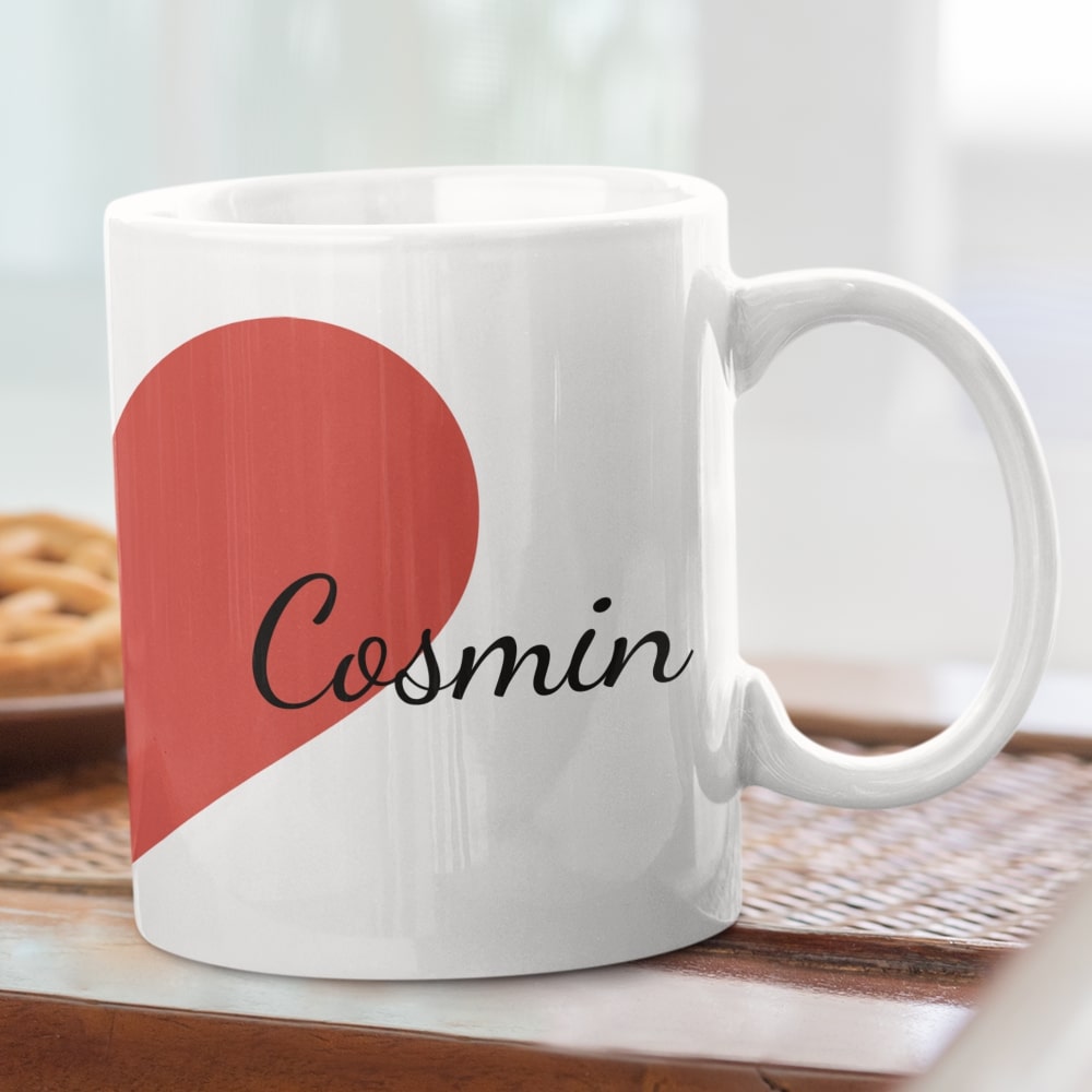 Produsul este alcatuit din doua cani, una pentru dama si una pentru barbat. Puse una langa alta formeaza o inima. Pentru ca unul fara altul nu sunteti completi, la fel sunt si cele doua cani. Canile personalizate sunt niste cadouri geniale, potrivite pentru orice ocazie.